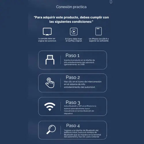 Funciona con vehículos que ya tienen CarPlay o Android Auto de fábrica. Si tu carro ya muestra estas funciones al conectar tu celular con cable, entonces este adaptador es compatible.